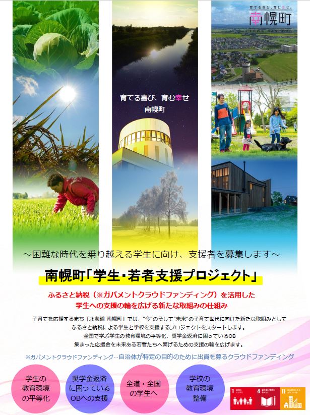 子育てを応援する町「北海道南幌町」では、ふるさと納税を活用してコロナ禍の学生・若者を応援する「学生・若者支援プロジェクト」を行っております。本プロジェクトは、南幌町がふるさと納税で募集した寄付金を趣旨に賛同する学校に助成し、学生への支援等に役立てられるしくみです。