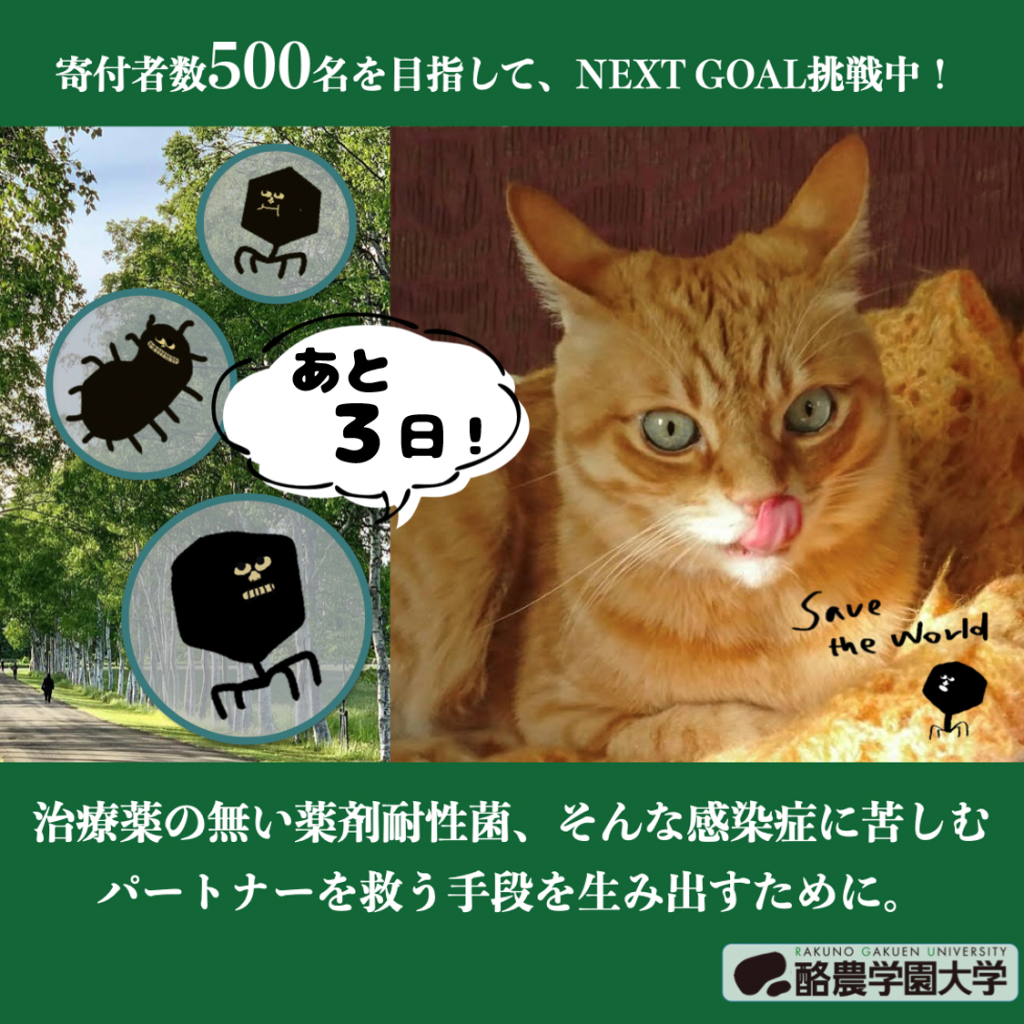 獣医学群獣医学類 獣医生化学ユニット 岩野英知教授が中心となり、クラウドファンディングサービス「READYFOR」にて募集中の「ファージが最愛のペットを救える未来へ-多剤耐性菌感染症の切り札-」が残り3日となりました。