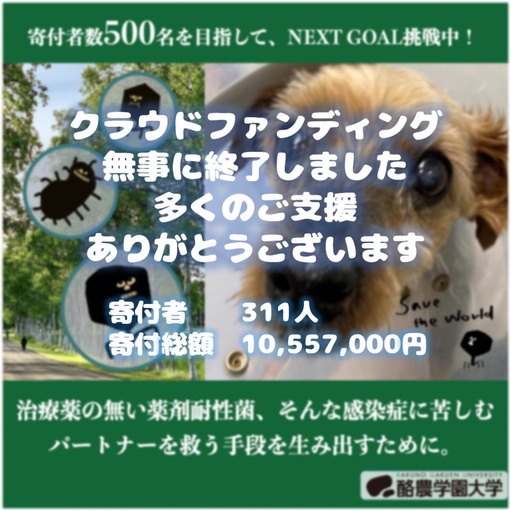 獣医学群獣医学類 獣医生化学ユニット 岩野英知教授が中心となり、クラウドファンディングサービス「READYFOR」にて募集中の「ファージが最愛のペットを救える未来へ-多剤耐性菌感染症の切り札-」が8月29日23時に終了しました。