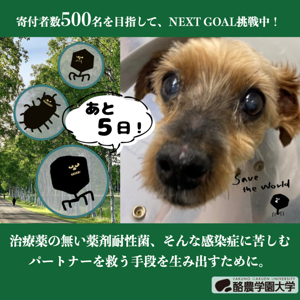 獣医学群獣医学類 獣医生化学ユニット 岩野英知教授が中心となり、クラウドファンディングサービス「READYFOR」にて募集中の「ファージが最愛のペットを救える未来へ-多剤耐性菌感染症の切り札-」が残り5日となりました。