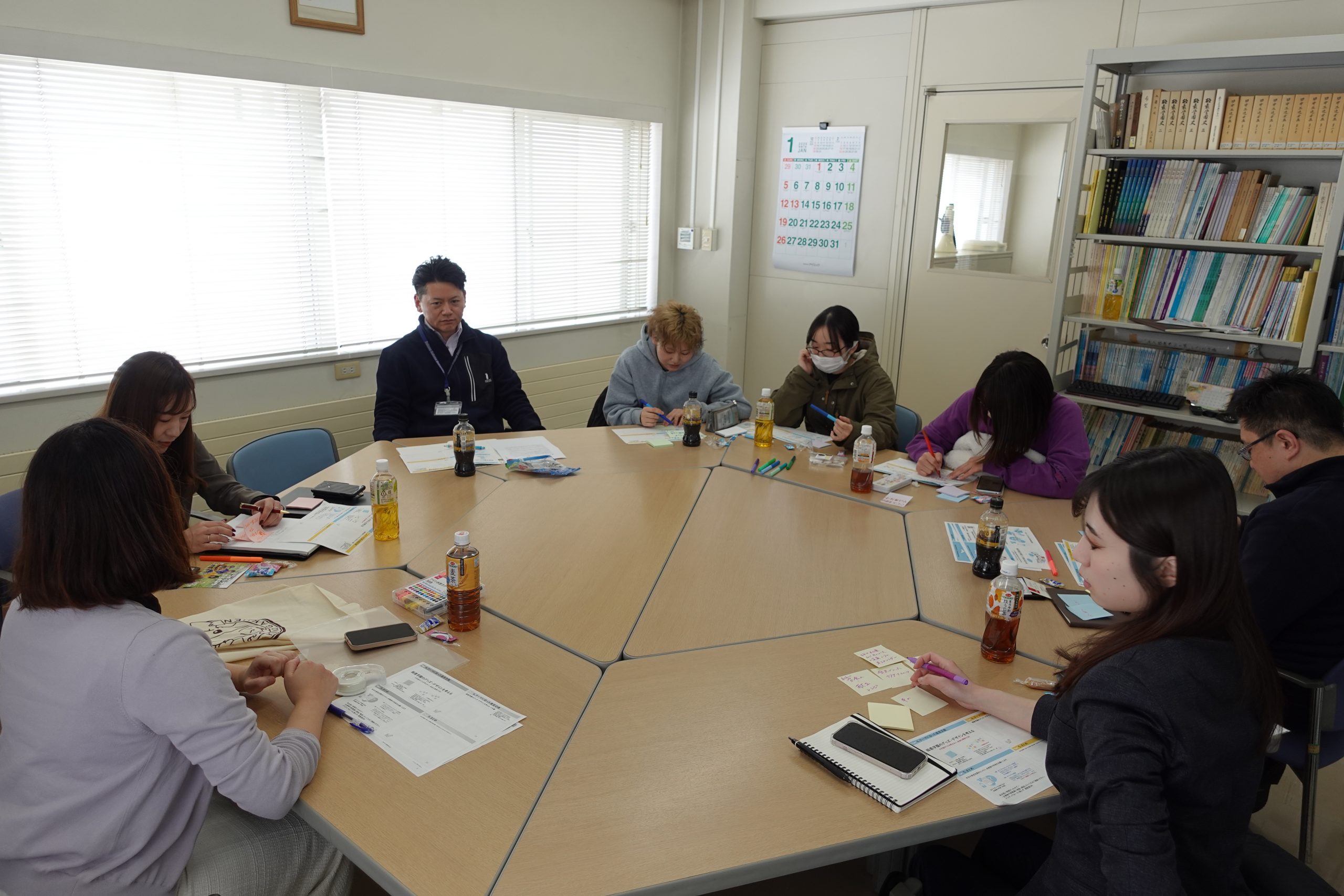 ▲テーブルを囲んで、とわの森三愛高等学校のハイチュウ・きびだんごを食べながら…話し、各自書きだしています。