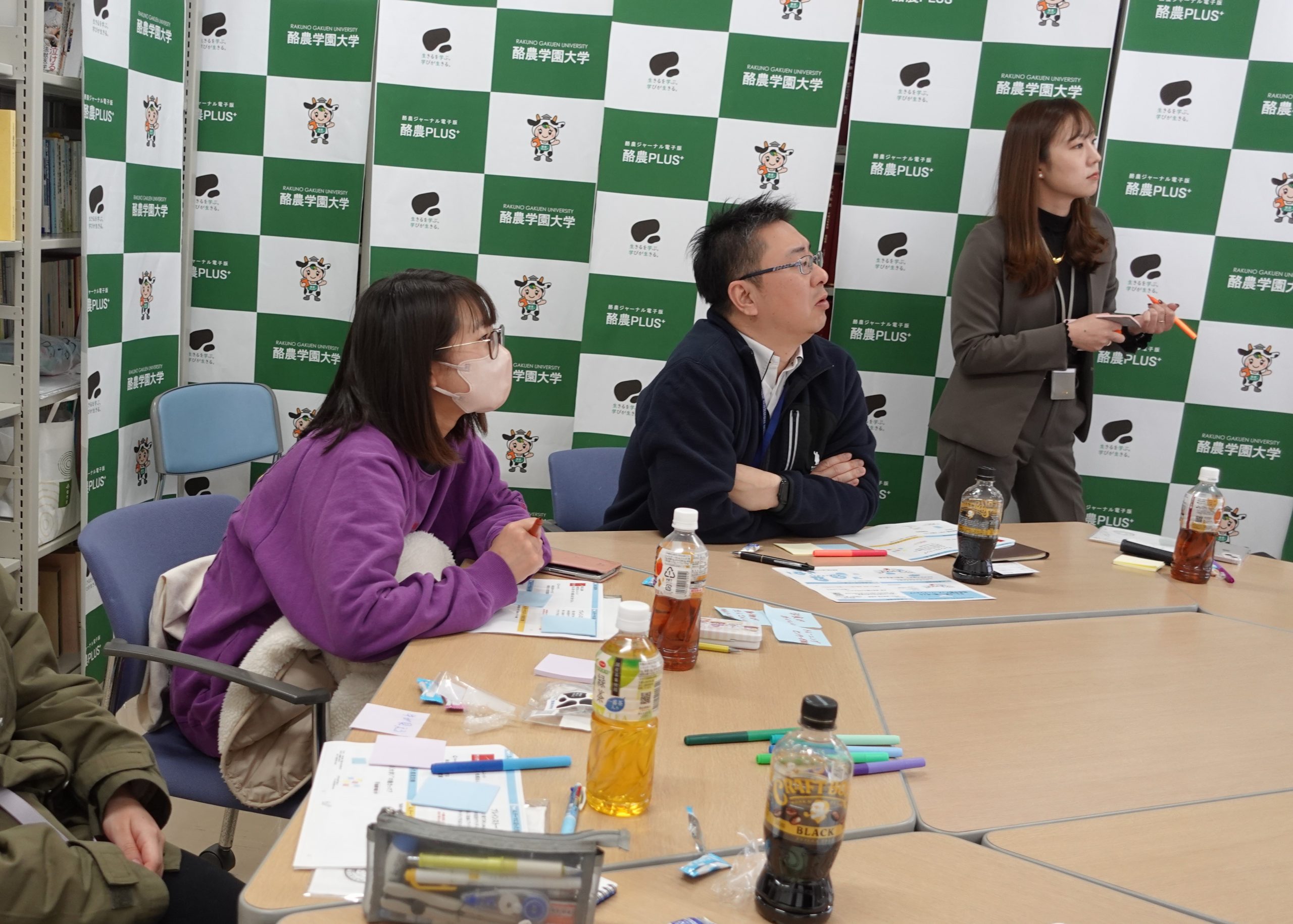 ▲(左)岡三証券株式会社の宮村さま ”酪農学園の魅力”を模造紙に貼っていきます。皆さん発表に耳を傾けています。