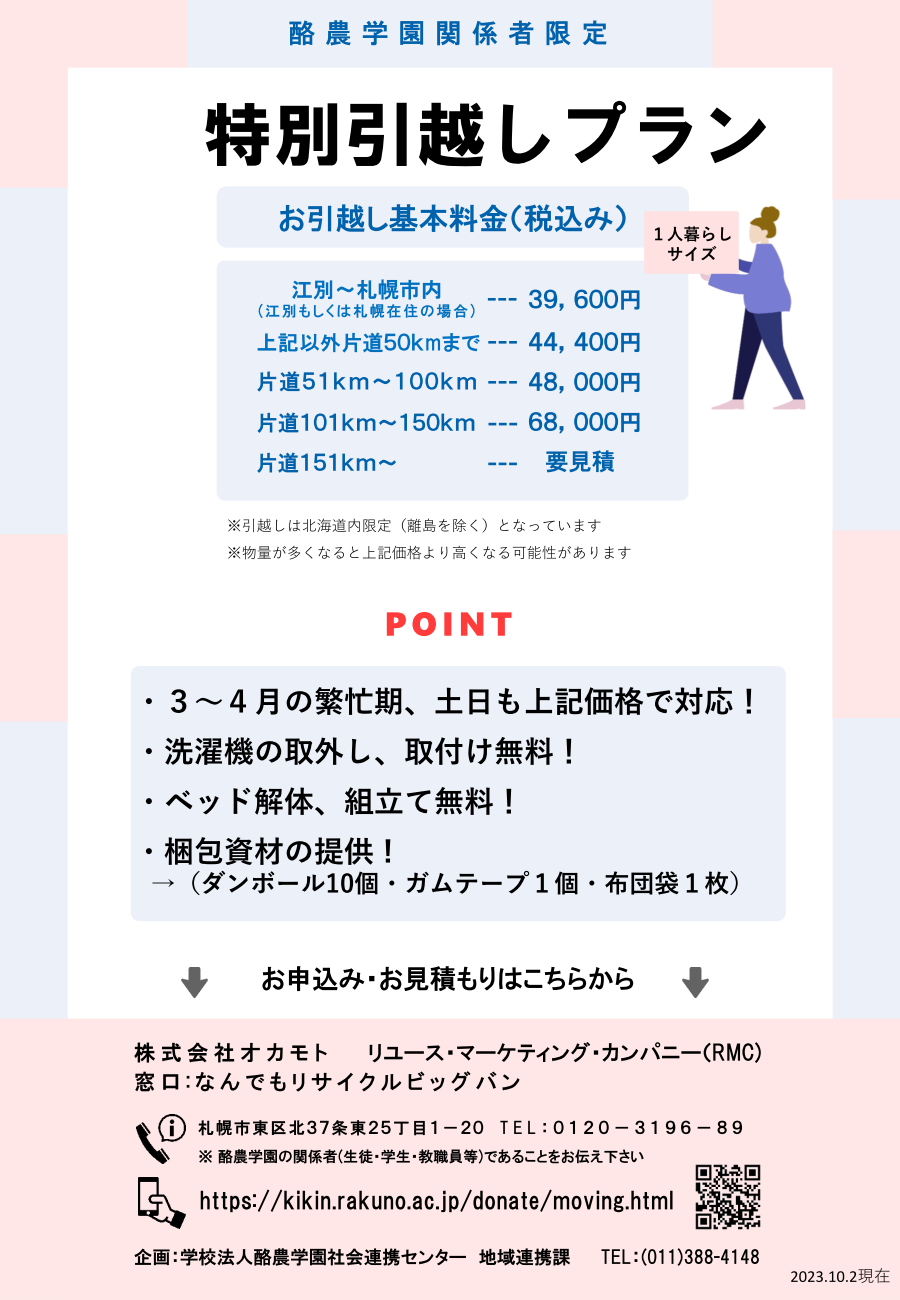 2021年度より株式会社オカモトリユースマーケティングカンパニー(RMC)(以下オカモト)と提携し、酪農学園の生徒・学生・教職員限定のお得な単身(一人暮らし)の引越しプランを提供していただいております。 酪農学園の生徒・学生・教職員が引越しすることで、オカモトから売上金の一部を寄付金として酪農学園が受領します。是非、オカモトでの引越しをご検討ください。