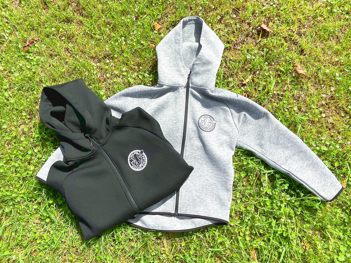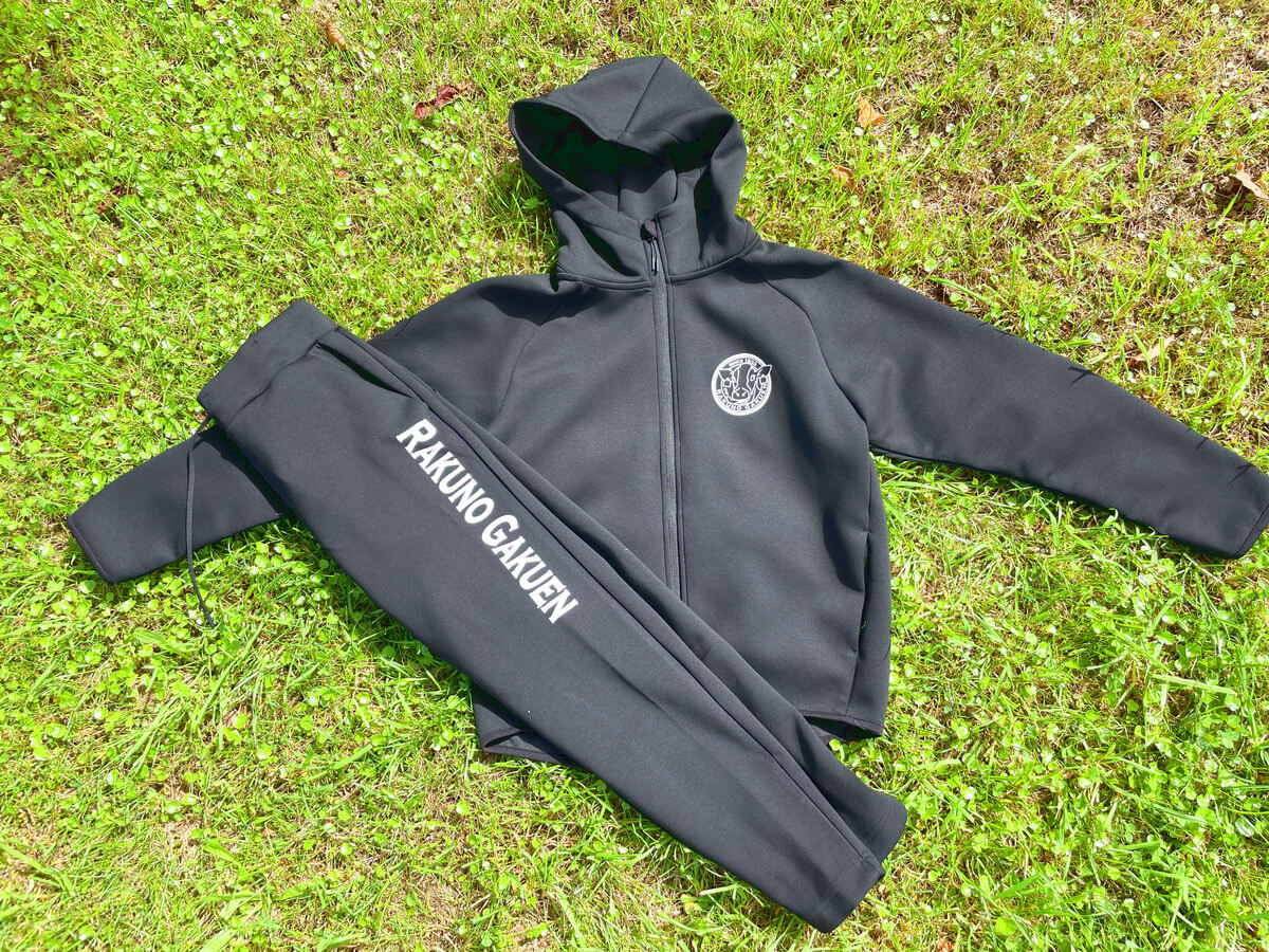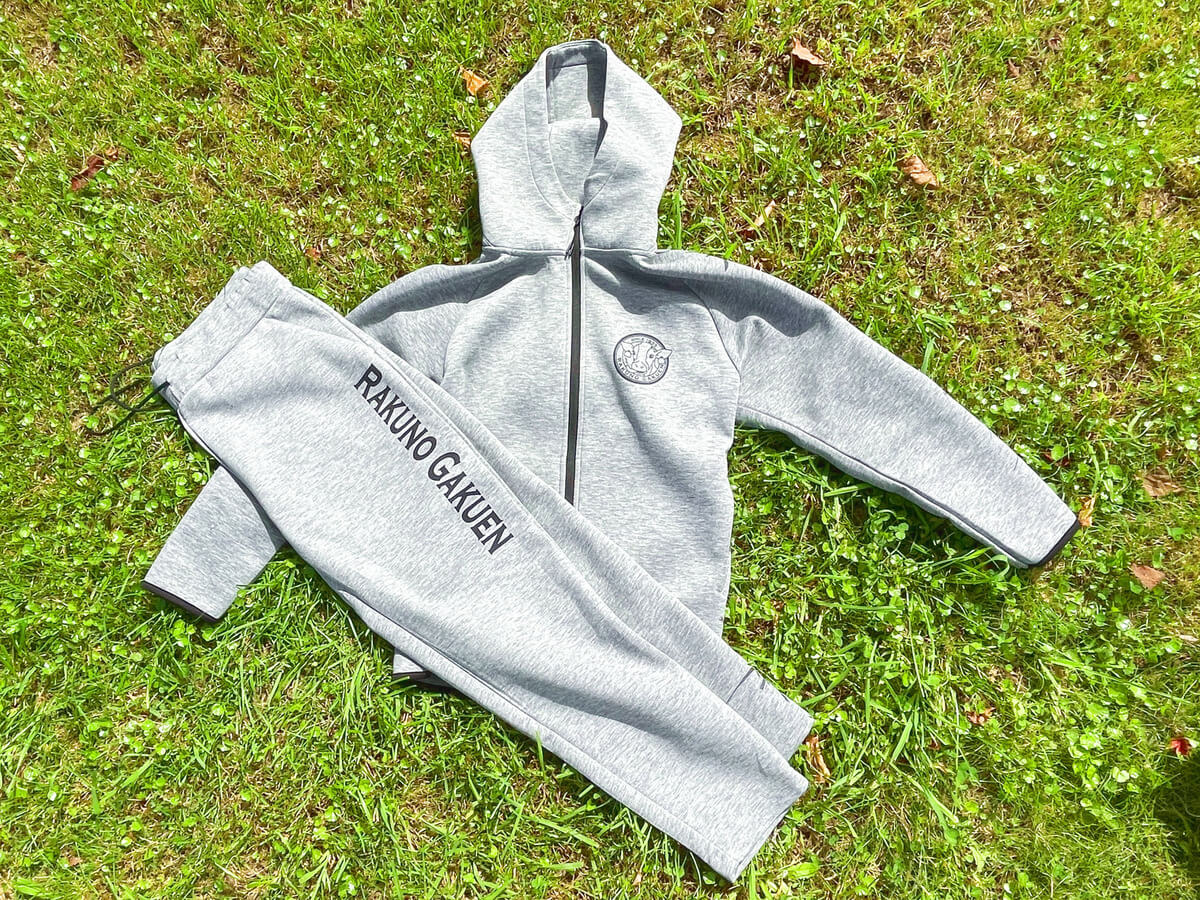 卒業生でもある職員がデザインした牛さんがプリントされたパーカーと、「RAKUNO GAKUEN」の文字がプリントされたパンツのセットです。段ボールニットで、しっかりとした生地です。ブラックとグレーの2色あります。