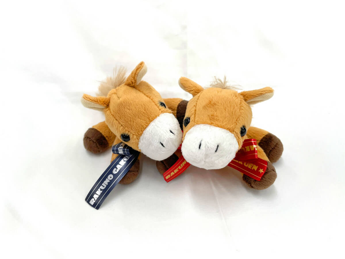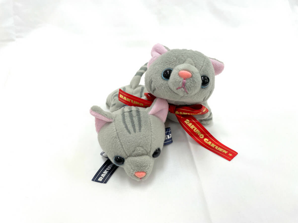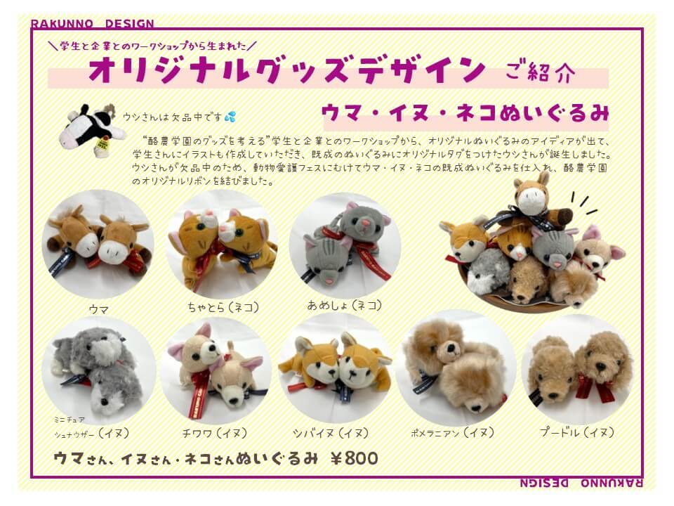 大人気の『オリジナル耳標つき牛ぬいぐるみ』が欠品中のため、2025年度「動物愛護フェスティバルinえべつ」にむけてウマ・イヌ・ネコの既成ぬいぐるみを仕入れ、酪農学園のオリジナルリボンを結びました。お子様に人気です。